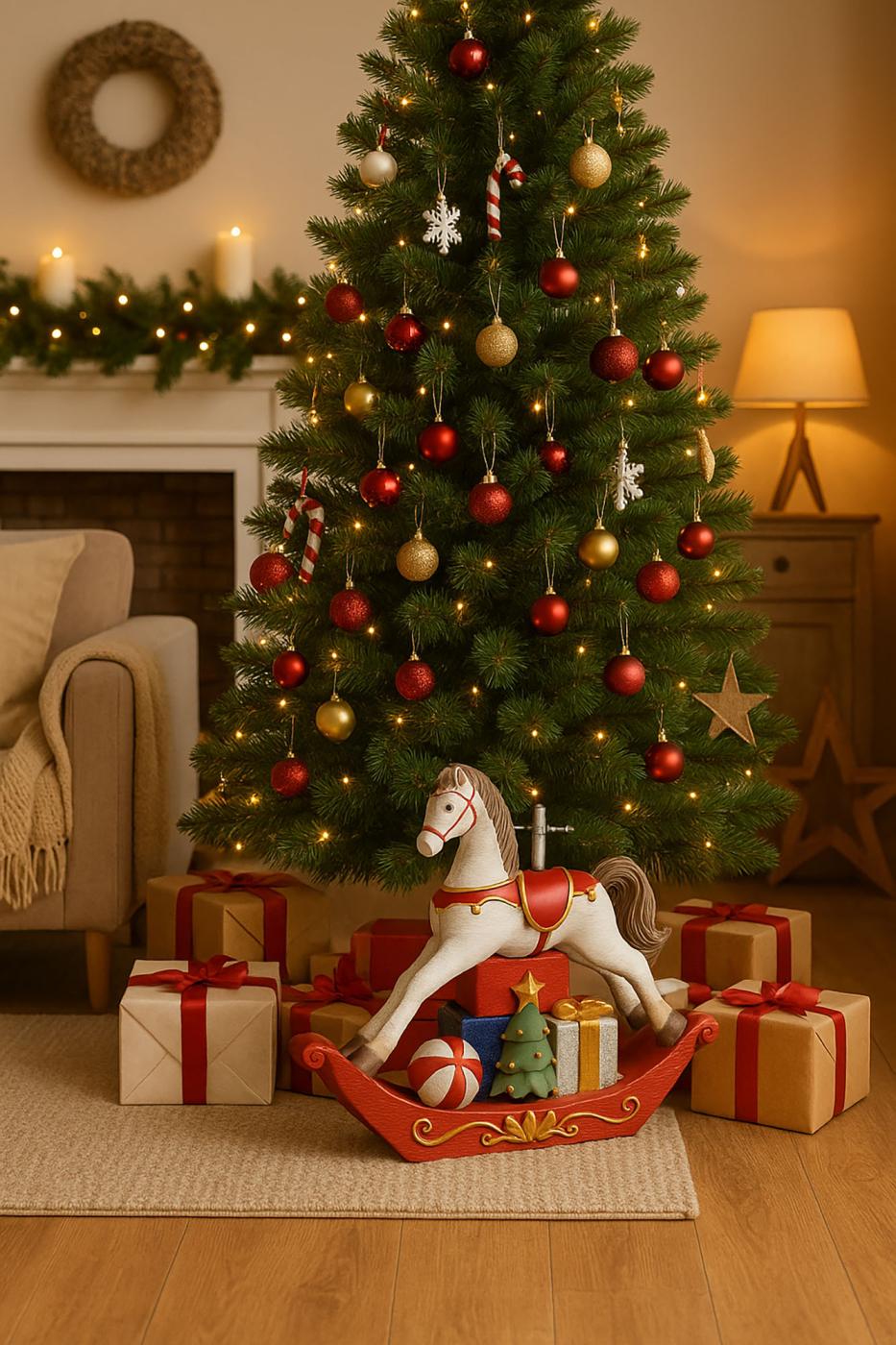 Questa simpatica base, che raffigura un dolcissimo cavallino a dondolo scolpito con grande attenzione ai dettagli, non è solo un pratico supporto per il tuo albero, ma diventa un vero e proprio elemento di design che arricchisce l’ambiente con allegria e calore.